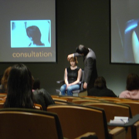 Programmed for VideoSonic, this combination of a Macromedia Director front-end talking to a Crestron Control System back-end allows instructors to control all elements within the classrooms or auditorium: lights can be dimmed, projectors controlled, videos played and rerouted, cameras controlled, audio routed and projector screens extended. All media elements can be routed and controlled from classroom to classrom or to any of the salons on the upper floors, or from the 103 seat auditorium. Each room has two cameras which can be routed just as any video source, or recorded to dvd media, allowing the school in essence, to be a television studio.